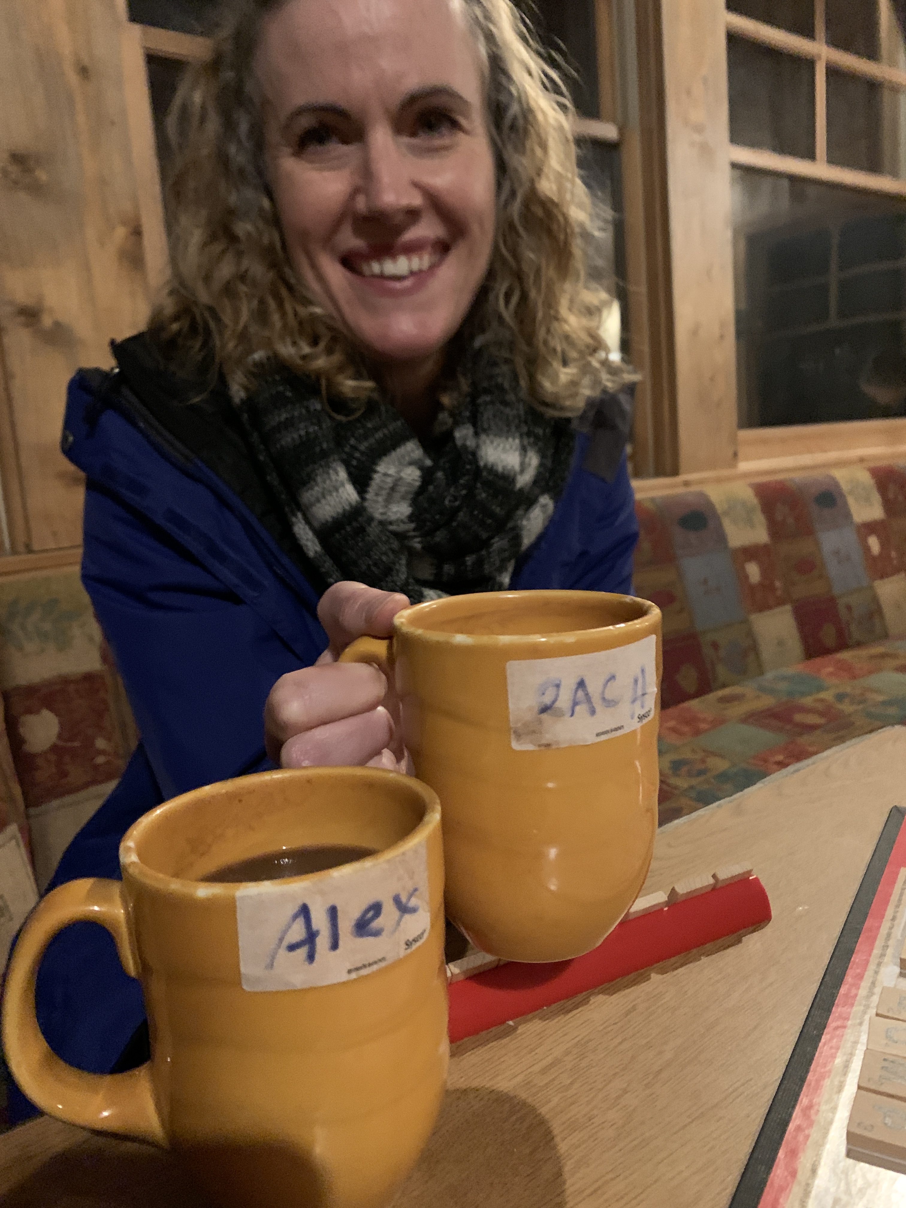 We made it to the inn after 2.5 hours and enjoyed a hot fire, hot chocolate and food! The rooms were single, bunk beds and wide enough to hang our backpacks. The common area was cozy with a supply of board games. My favorite (insert sarcasm) compost bathrooms were available, including a slight breeze up the backside, to remind you that you were roughing it.