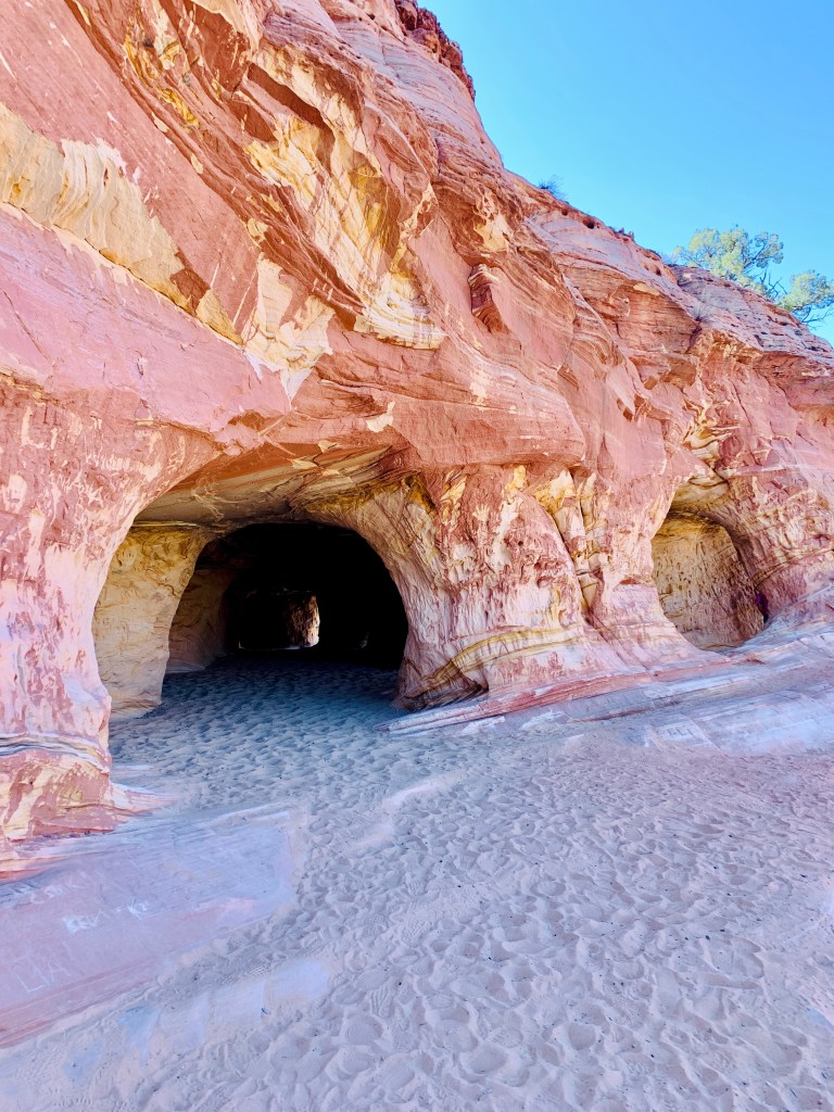 Kanab, Utah is a quiet town and great location to visit all the parks. Upon arrival we showered, ate and set out to see nature. Finding caves along the way, the winding road led to some remarkable natural wonders. One day of cave exploring found us viewing dinosaur footprints. The climb to the cave reminded me that my fear of heights is real and going down is not always easier.