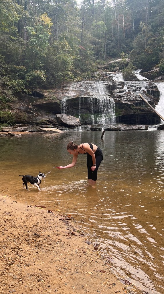 The waterfall was absolutely breathtaking with a sandy beach! Onyx played with two other dogs 10x his size, he swam as many people do when the weather allows. We met people along the trail but at the falls spoke with a man my age and his dog from Lilburn, just out for some peace!