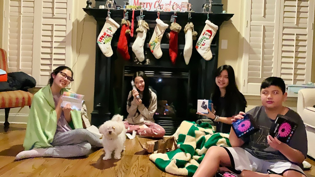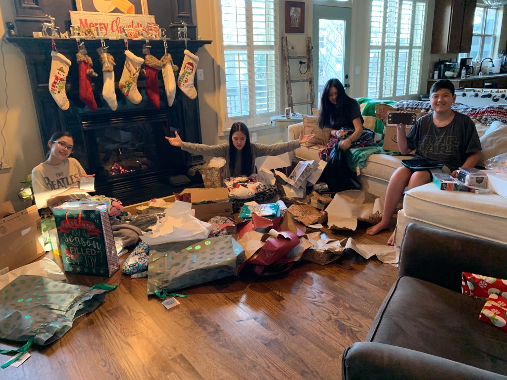 I was chatting (i.e. texting and seeing who responded) with the kids and Kati reminded me of one I had forgotten. We would create a paper chain, the kind you make in pre-school, with different things inside it, “Disney trip” or “shopping spree” and the kids would take these off the tree and read the gift.